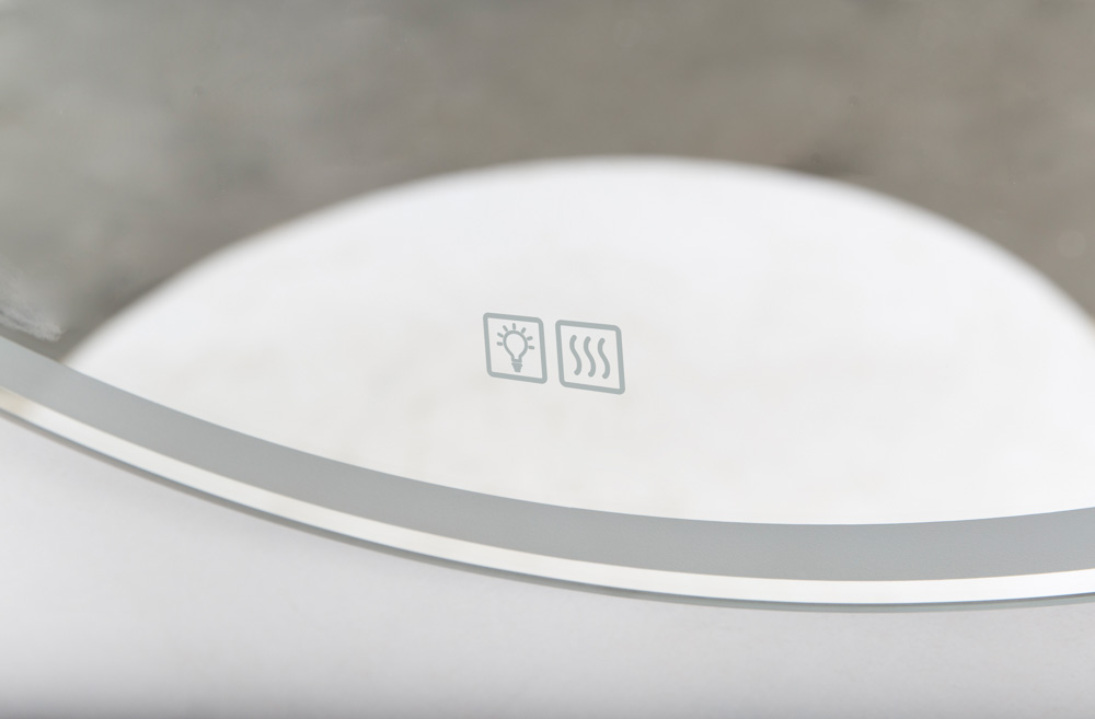 Декоративная светодиодная подсветка по всему периметру зеркала. Возможность регулировки яркости (диммер) подсветки.Подогрев полотна зеркала.Обратная сторона зеркала защищена пластиковой панелью от попадания воды и влаги. На зеркале установлен двойной сенсор, блок увеличеной мощности, с помощью которого производиться отдельное включение подсветки и подогрева зеркала. Однократное нажатие сенсора включает или выключает функцию, соответственно символу на зеркале, длительное удержание выключает подсветку клавиш сенсора.Характеристики